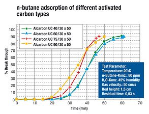 Активоване вугілля для вугільних повітряних фільтрів має відповідати визначеним критеріям якості та ефективності. Методи випробувань і критерії оцінки ефективності адсорбції та утримання частинок фільтрів і фільтруючих елементів викладені в DIN 71460. У цих випробуваннях адсорбційна здатність різних сортів активованого вугілля перевіряється в певних умовах на різних тестових газах, таких як н-бутан, толуол, діоксид сірки та аміак. Рекомендована якість AC: Alcarbon PH 50/30 x 60 Desorex KF 30 x 60 Alcarbon K 60/ 5% KJ 30×70 Інші якості просочення доступні за запитом.