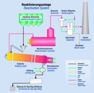 Після десорбції та піролізу забруднюючих речовин активоване вугілля, яке тепер знову не завантажене, знову активується парою. Забруднюючі речовини, що вивільняються в процесі реактивації, знищуються при високих температурах до 1200 °C на наступній стадії спалювання з подальшим очищенням димових газів.